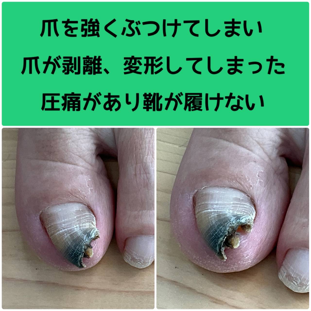 足の爪を強くぶつけて、変形、変色、痛みもある